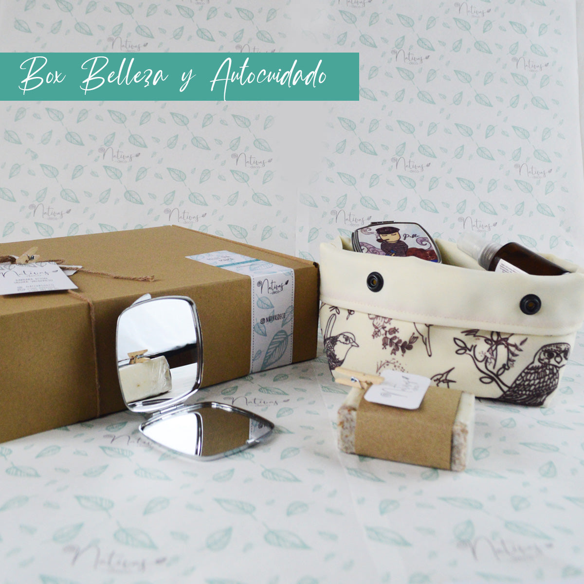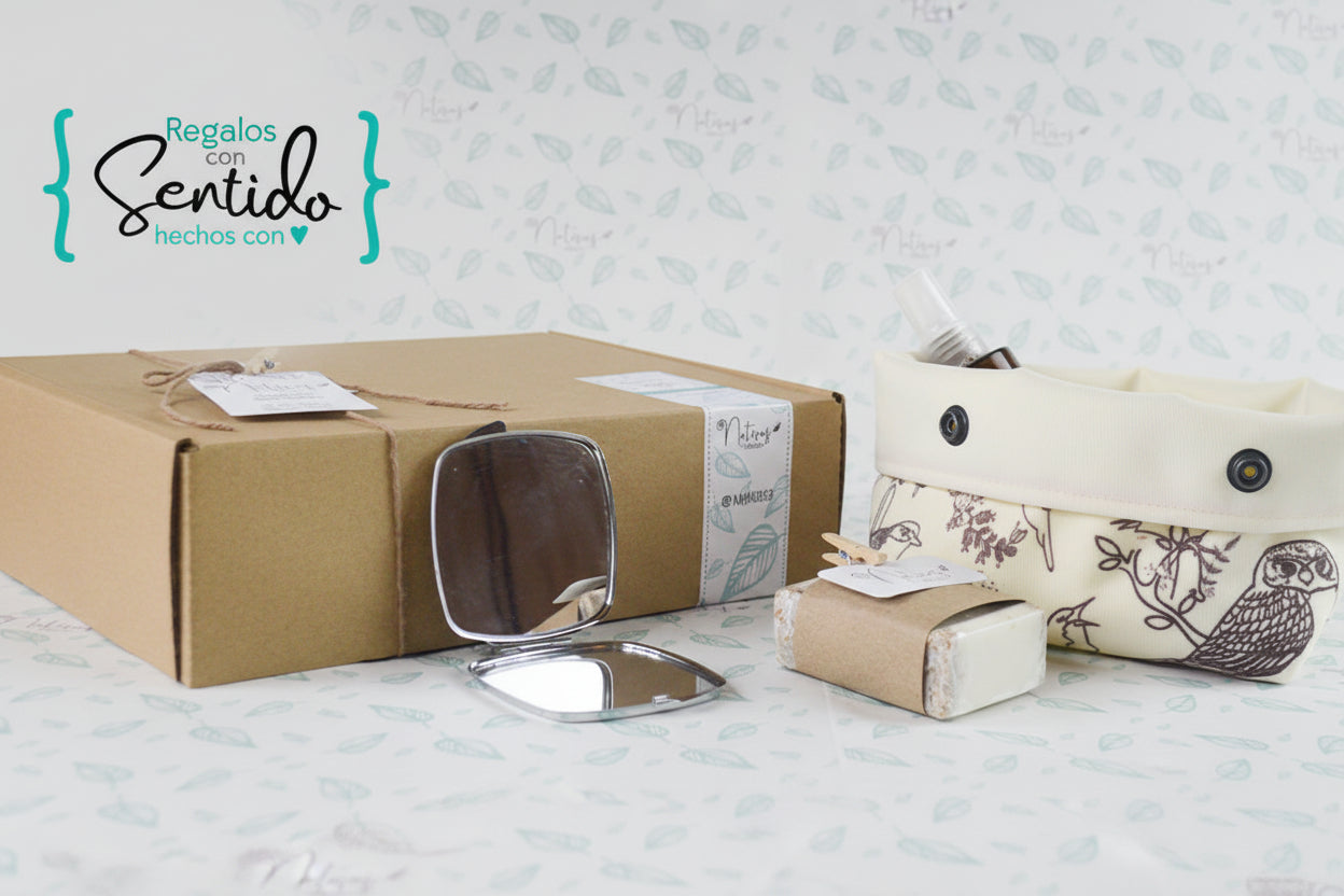 Ideal para quienes buscan un regalo ideal para sus colaboradoras, ddicado al autocuidado y bienestar, incluye: espejo Aves, Jabón natural (amankay organic) y estuche cosmetiquero fauna que habita en Chile, personalizado.