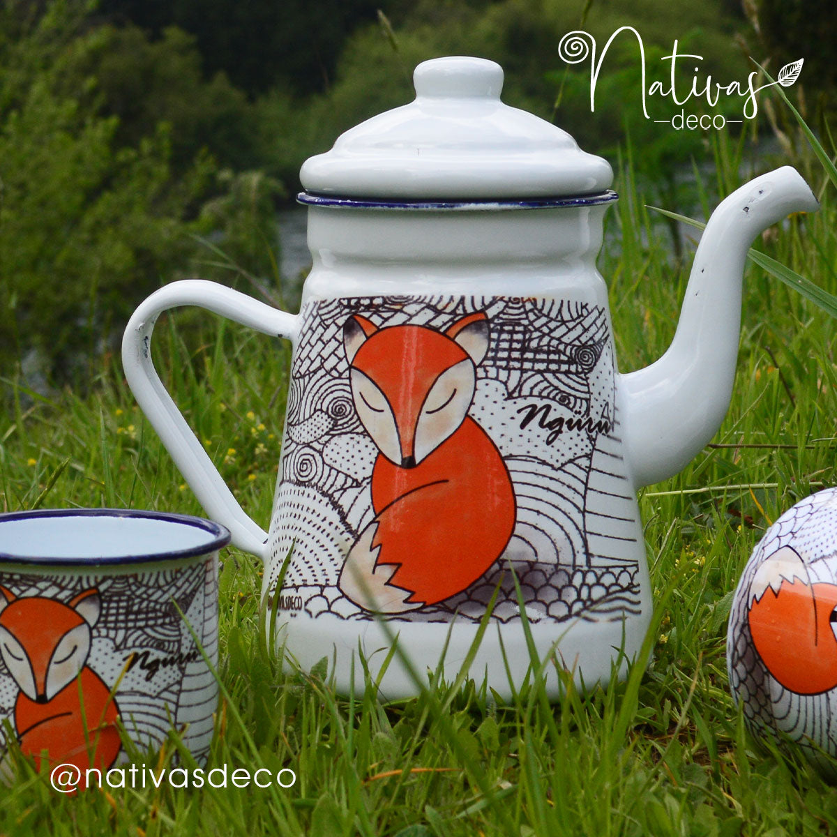 Teteras enlozadas, tienen capacidad para 1.5 ltrs y diseños originales inspirados en la Fauna que habita en nuestro País. Visibilizando la Fauna, como el bello Fiu o siete colores, el Chucao y el zorro, en objetos útiles y lindos ❤️